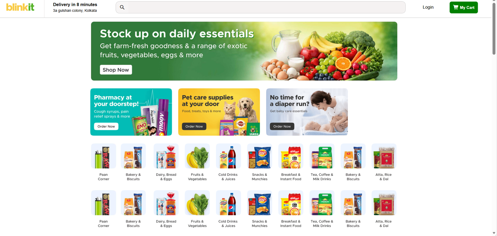 This project is a responsive front-end clone of the Blinkit grocery delivery website, built to recreate a modern quick-commerce user interface. It includes a structured homepage layout with delivery information, search bar, promotional banners, category sections, horizontally scrollable product rows, pricing cards, and footer content. The project focuses on clean e-commerce layout design, card-based product presentation, and responsive behavior across mobile, tablet, and desktop screens.