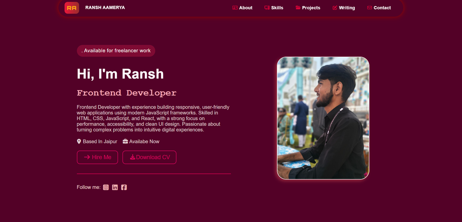 I’m Ransh Aamerya, a Frontend Developer specializing in modern, responsive, and visually polished websites. I build clean, fast, and user-focused web experiences using HTML, CSS, JavaScript, and React.
